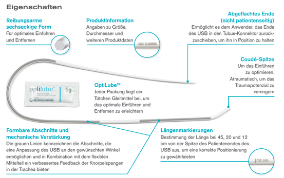 Ein weiteres Merkmal ist seine sechseckige Form, die den Kontakt zur Innenwand des Trachealtubus minimiert. Das erleichtert sowohl das Einführen als auch das Herausziehen des USB deutlich.