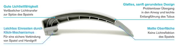 Vorteile: Günstige und leichtgewichtige Alternative zu Metall-Spateln; verlässlicher Lichttransfer zur Spitze des Spatels; sichere Verbindung von Spatel und Handgriff; problemloser Übergang in den Airway und leichte Entlangführung des Tubus; keine störende Lichtreflektion.