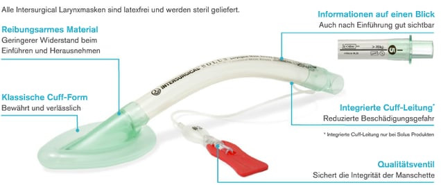Ein umfassendes Sortiment an Larynxmasken zum Einmalgebrauch, darunter die Standardlösung Solus aus PVC, die drahtverstärkte Solus Flexible, die besonders weiche Solus Satin und die Larynxmaske Supra aus Silikon. Alle Intersurgical Larynxmasken sind latexfrei und werden steril geliefert.