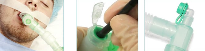Die Flip Top Cap ermöglicht durch Öffnen der ersten Kappe die Einführung eines Bronchoskops, während der Atemwegsdruck aufrecht erhalten bleibt. Die Öffnung der zweiten Kappe ermöglicht die Absaugung.