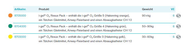 Das i-gel O2 Resus Pack ist in drei Größen für Erwachsene erhältlich: